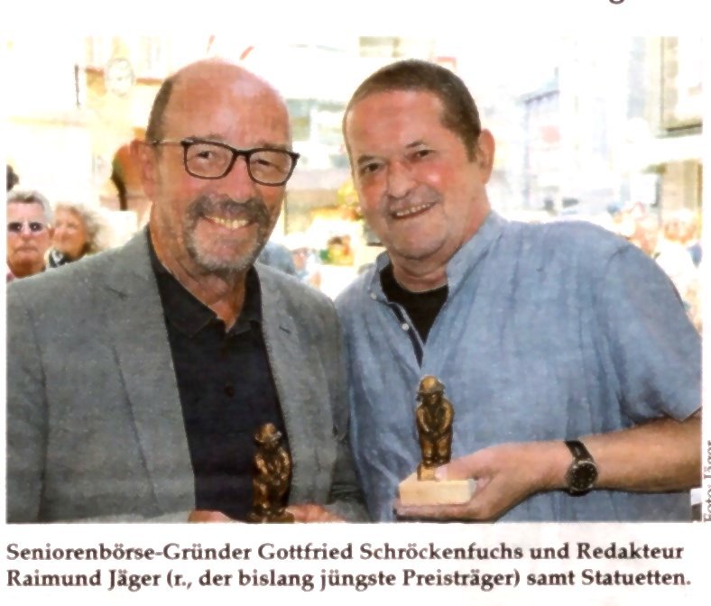 Der alljährlich für Verdienste um die Stadt Bregenz verliehene „Ehrenseebrünzler“ wurde am Samstag (Anm:04.07) an Gottfried Schröckenfuchs, Gründer der Seniorenbörse, sowie an „Blättle“-Redakteur Raimund Jäger vergeben.