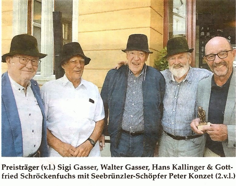 Den aus einer Privatinitiative hervorgegangenen „Ehrenseebrünzler“ erhielten in den letzten Jahren unter anderem Altbürgermeister Sigi Gasser, Heimatdichter Walter Gasser oder ,,Unser aller Ländle“-Initiator Hans Kallinger. Auch in diesem Jahr überreichte Seebrünzler-Schöpfer Peter Konzet die begehrte Miniatur-Ausgabe der beliebten Kirchstraßen-Sehenswürdigkeit, nachdem zuvor dem unlängst verstorbenen Mitinitiator Helmuth Bruckner gedacht wurde.