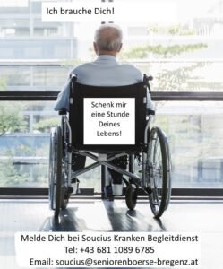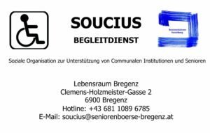 Die Seniorenbörse-Bregenz hat mit 1. Januar 2016 den Begleitdienst für SeniorenInnen, ursprünglich von Ursula Starck ins Leben gerufen, übernommen. Unter dem Namen SOUCIUS unternimmt ein Team der Seniorenbörse die Aufgabe pflegebedürftige und teilweise an den Rollstuhl gebundene SeniorenInnen zu Arzt-…