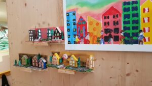 Begonnen haben wir mit der Modellbahn. Inzwischen wird gemalt und auch andere Bastelarbeiten gemacht. Vogelhaus, Teppichknüpfen, Becherhalter für Zahnputzbecher, Bilder malen, reparieren am Holzspielzeug usw