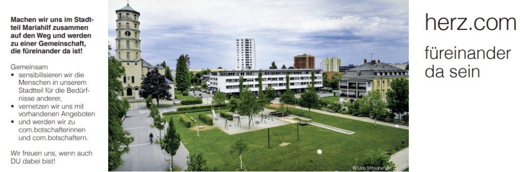 gerne möchte ich euch zu unserem letzten Treffen vor dem Sommer einladen. Wir werden gemeinsam zurückblicken auf das was bisher geschah und auch den Blick nach vorne richten. Im Herbst ist noch einiges geplant und dies möchte ich euch gerne vorstellen. Mit offenen Augen und Ohren durch den Stadtteil gehen und auf die Menschen zugehen wenn es Bedarf gibt, dies ist das Ziel von herz.com. Eine sorgende Gemeinschaft bilden, einen Stadtteil mit Herz, für dies stehen die com.botschafter*innen und dafür danke ich euch von ganzem Herzen. Die Eröffnung der Erzählbänke am 24.06.2023 um 19:00 im Park Mariahilf dient auch der Sensibilisierung zum Thema Einsamkeit. Sich Zeit nehmen für Andere, zuhören und ins Gespräch kommen. In dieser schnelllebigen Zeit ist dies ein Luxusgut. Für das Wohlbefinden jedes einzelnen und für die psychische Gesundheit ist dies aber enorm wichtig. Unser Stadtteil geht mit gutem Vorbild voran und zeigt, dass es möglich ist und sogar Freude bereitet. Denn durch die gelebte Nächstenliebe, bekommen wir ganz viel zurück und auch auf unser eigenes Wohlbefinden hat es eine positive Auswirkung.