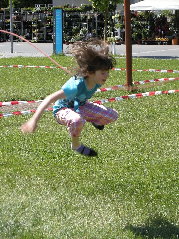 Spielstationen. Gummitwist, Himmel und Hölle, Hula Hoop und auch